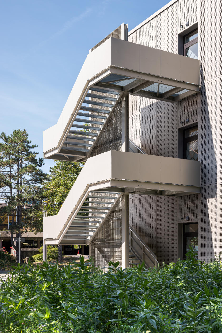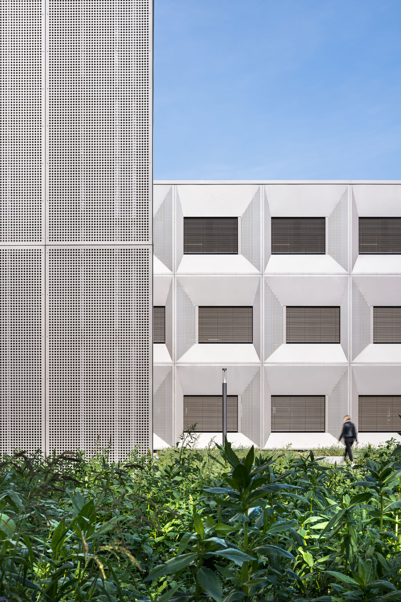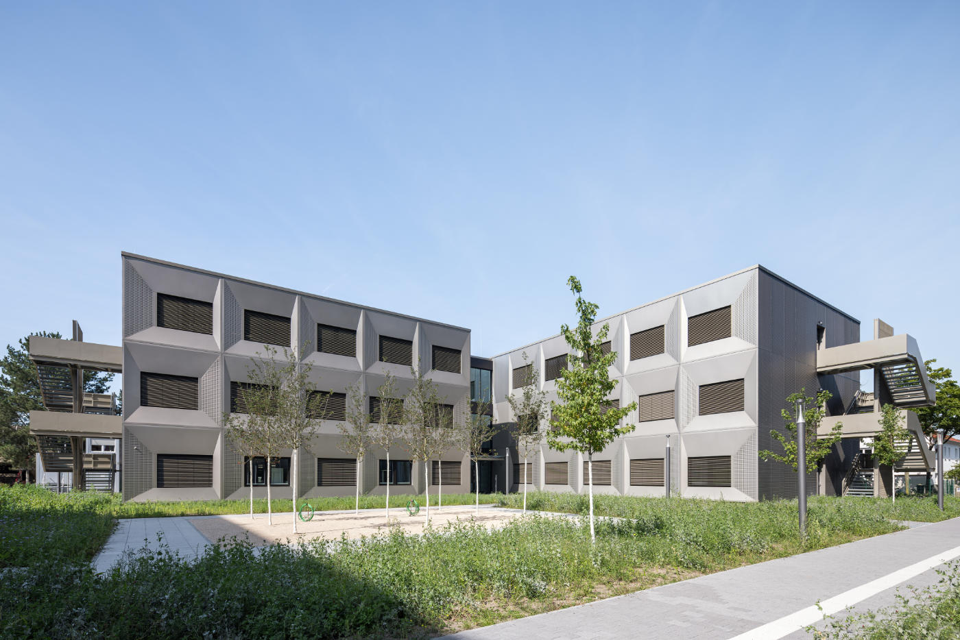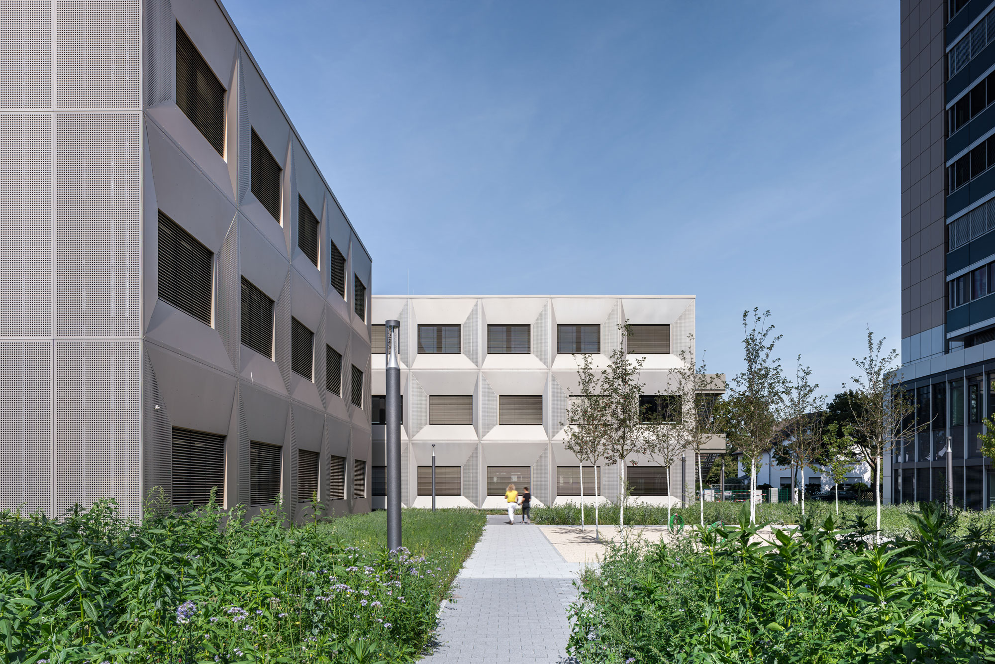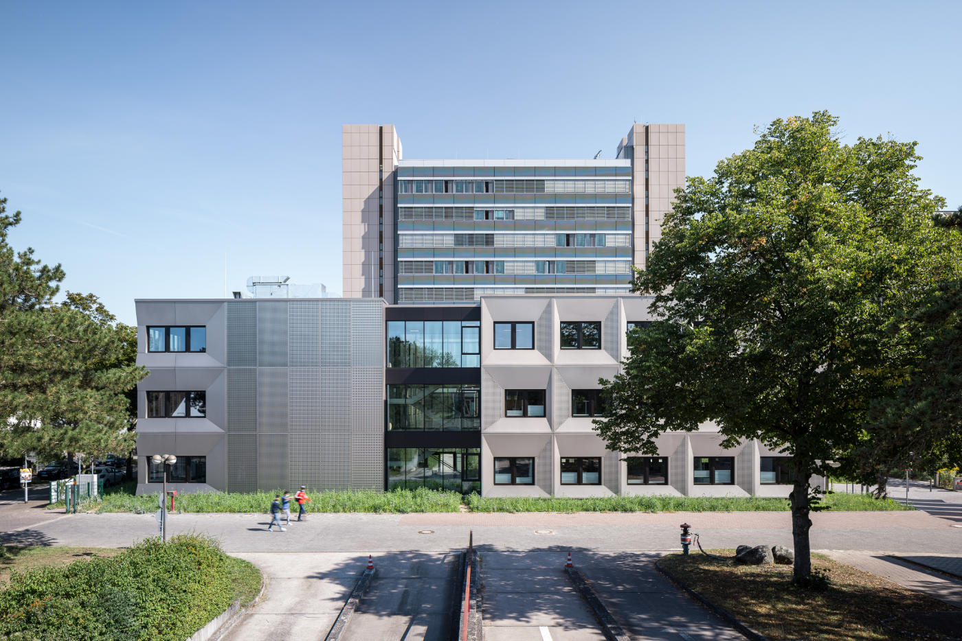 Der Ergänzungsneubau wurde als System-Modulbau anstelle einer Parkplatzfläche und des ehemaligen Pförtnerhäuschens errichtet. Der L-förmige Bau schließt das Ensemble städtebaulich zur Straße hin ab und formuliert einen neuen Innenhof. Die reliefartige Fassade illustriert den modularen Aufbau des Gebäudes und ergänzt mit ihrer Farbigkeit zeitgemäß die Gestaltung der Bestandsgebäude. Der Baukörper beherbergt sechs Büroeinheiten auf drei Geschossen. Hier sollen in den nächsten Jahren flexible und innovative Arbeitskonzepten für den neuen Standort erprobt werden.